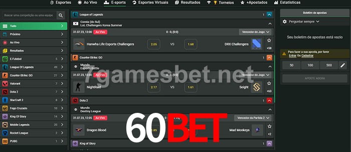 O 60bet oferece uma grande seleção de opções de apostas em e-sports com probabilidades competitivas